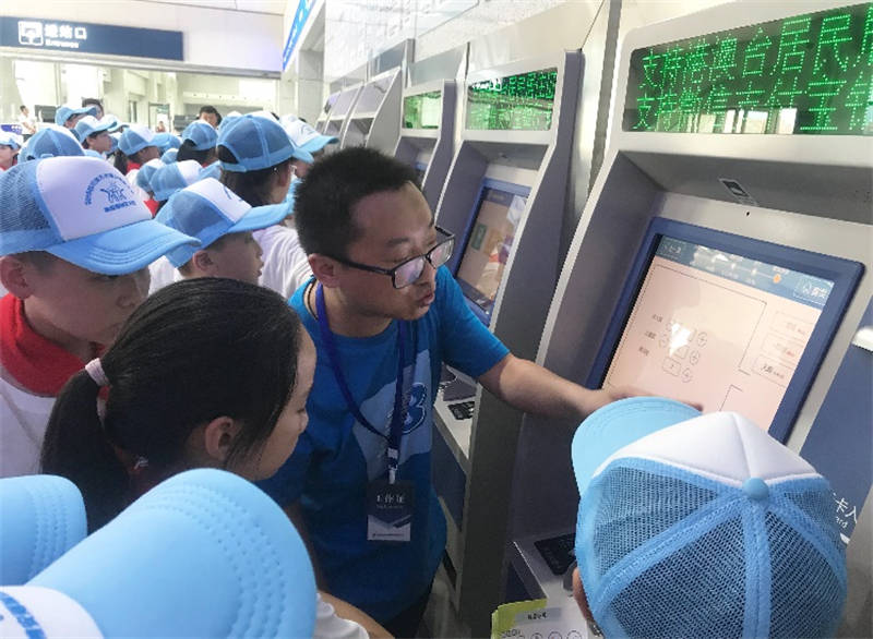 在雅安火車站行政辦公樓旁的操場上,運通公司工作人員就雅安火車站相關(guān)情況向孩子們進(jìn)行了簡單介紹,對孩子們提出的問題進(jìn)行了一一解答。下午4點13分,伴隨響亮的鳴笛聲,一輛動車駛出站臺,孩子們歡呼雀躍,興奮不已。在雅安火車站售票大廳,運通公司員工向孩子們講解了自助購、取票操作流程。