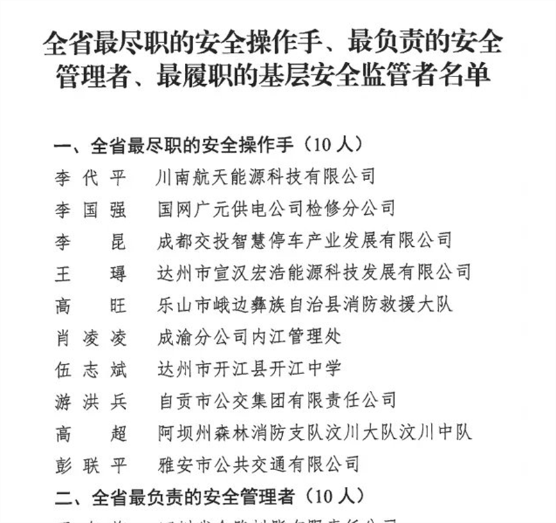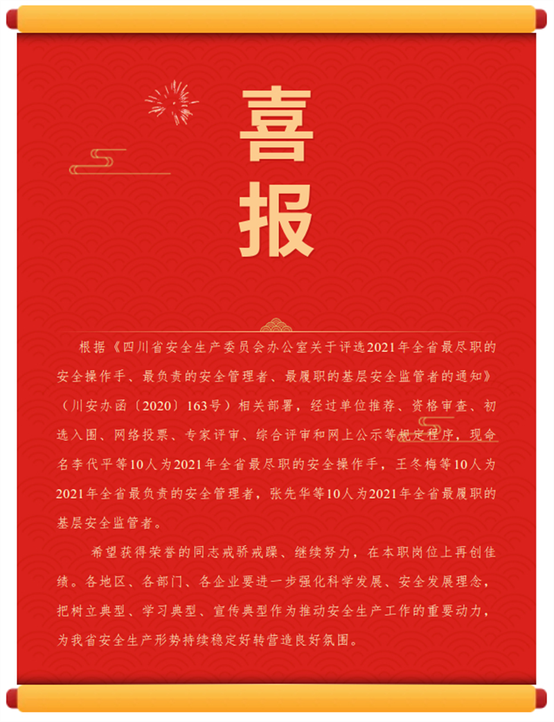 此次評選活動(dòng),最終命名“全省最盡職的安全操作手、最負(fù)責(zé)的安全管理者、最履職的基層安全監(jiān)管者”各10名。彭聯(lián)平通過單位自薦、資格審查、初選入圍、網(wǎng)絡(luò)投票、專家評審、綜合評審和網(wǎng)上公示層層選拔,最終獲得“2021年全省最盡職的安全操作手”稱號,是雅安市唯一獲此殊榮的個(gè)人。