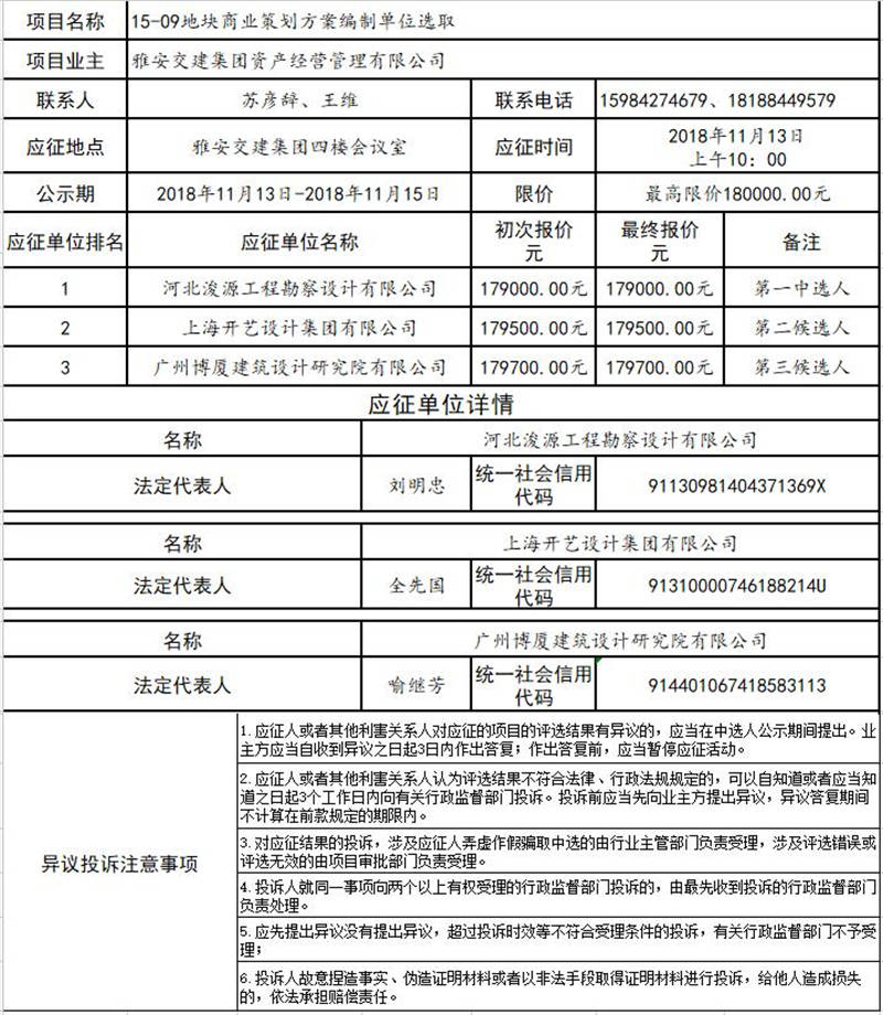 雅安交建集團資產(chǎn)經(jīng)營管理有限公司15-09地塊商業(yè)策劃方案編制單位選取結(jié)果公示