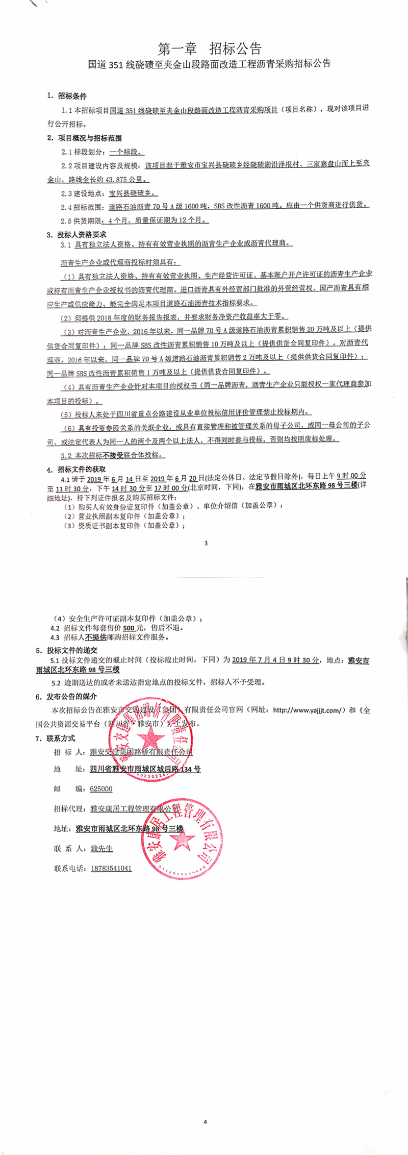 雅安交建集團(tuán)路橋有限責(zé)任公司國(guó)道351線磽磧至夾金山段路面改造工程瀝青采購招標(biāo)公告