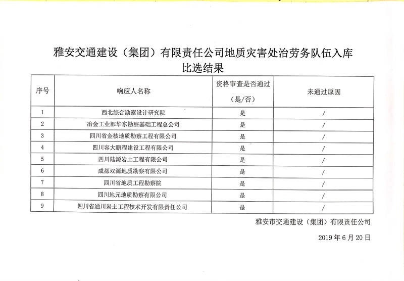 雅安交通建設(shè)(集團)有限責任公司地質(zhì)災(zāi)害處治勞務(wù)隊伍入庫比選結(jié)果