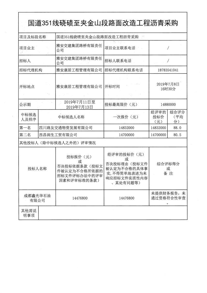 雅安交建集團路橋有限責(zé)任公司國道351線磽磧至夾金山段路面改造工程瀝青采購公開招標結(jié)果公示