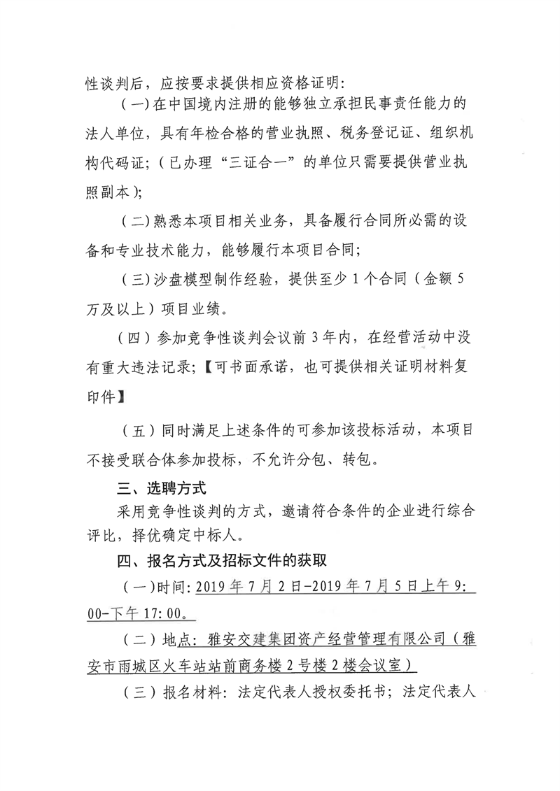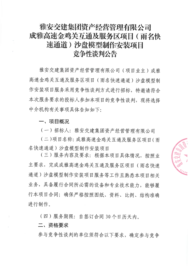 雅安交建集團資產經營管理有限公司成雅高速金雞關互通及服務區(qū)項目(雨名快速通道)沙盤模型制作安裝項目競爭性談判公告