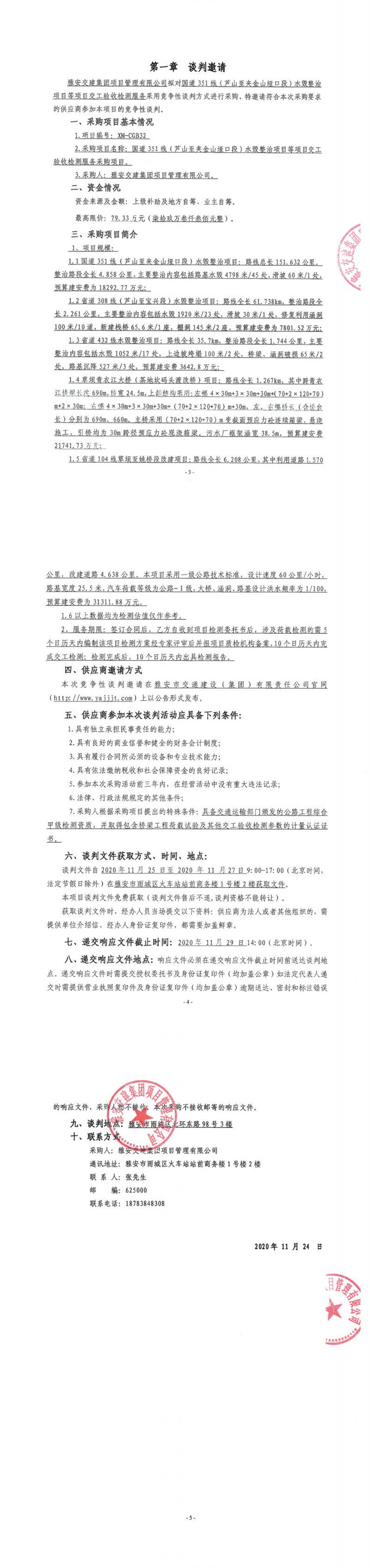 雅安交建集團項目管理有限公司國道351線(蘆山至夾金山埡口段)水毀整治項目等項目交工驗收檢測服務(wù)采購項目競爭性談判公告