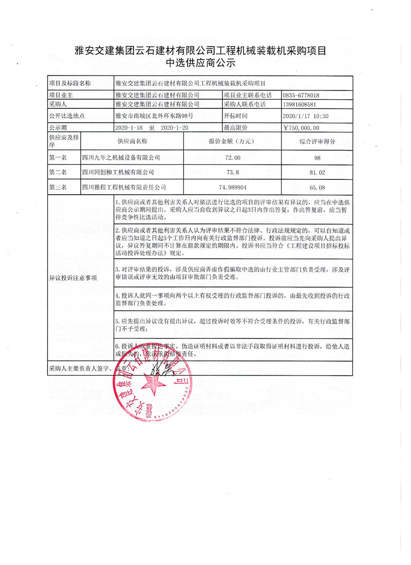 雅安交建集團(tuán)云石建材有限公司工程機(jī)械裝載機(jī)采購項目中選供應(yīng)商公示