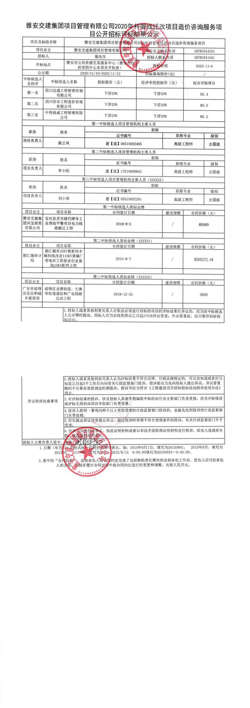 雅安交建集團項目管理有限公司2020年桿管線遷改項目造價咨詢服務項目公開招標評標結(jié)果公示