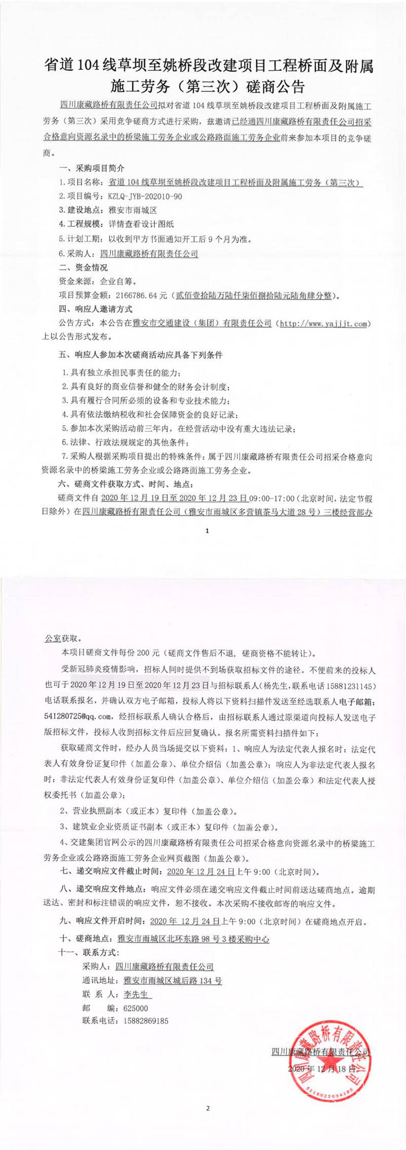 四川康藏路橋有限責任公司省道104線草壩至姚橋段改建項目工程橋面及附屬施工勞務(wù)(第三次)磋商公告