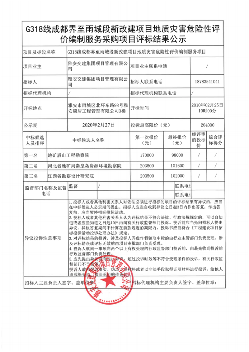 雅安交建集團項目管理有限公司G318線成都界至雨城段新改建項目地質(zhì)災(zāi)害危險性評價編制服務(wù)項目評標(biāo)結(jié)果公示