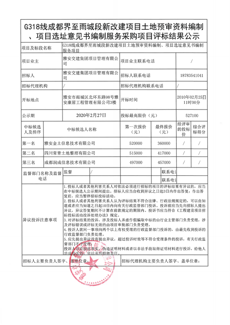 雅安交建集團(tuán)項(xiàng)目管理有限公司G318線成都界至雨城段新改建項(xiàng)目土地預(yù)審資料編制、項(xiàng)目選址意見書編制服務(wù)采購項(xiàng)目評標(biāo)結(jié)果公示