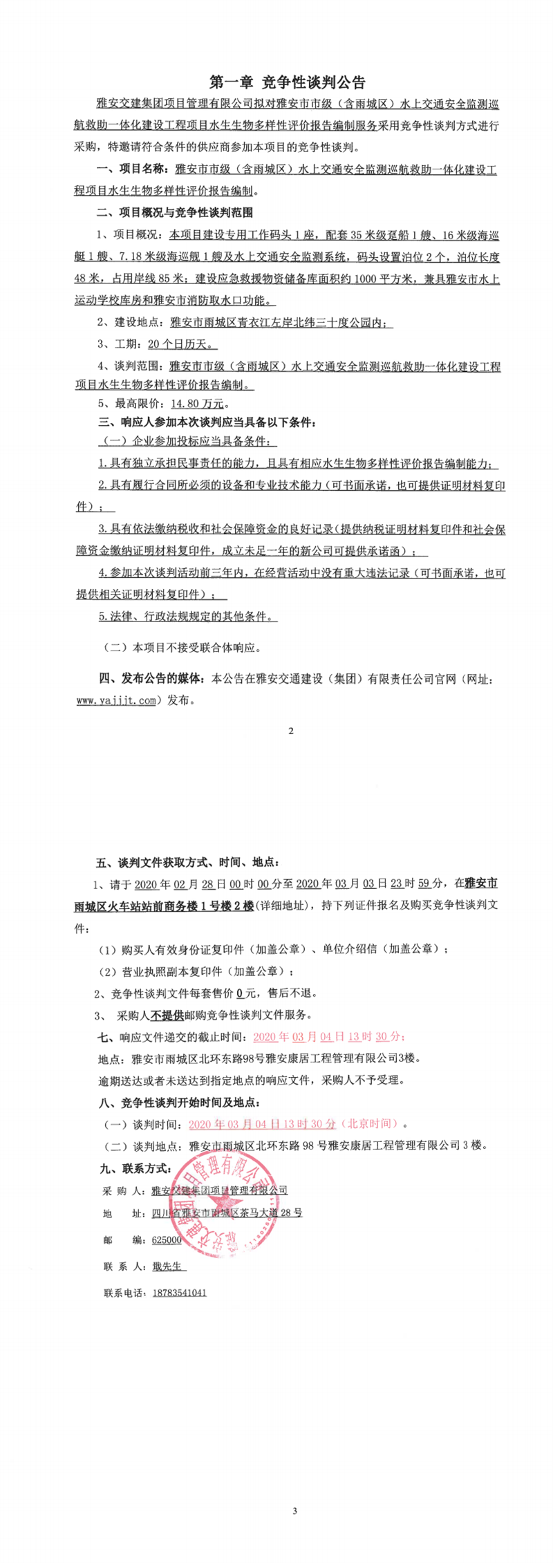 雅安交建集團(tuán)項目管理有限公司雅安市市級(含雨城區(qū))水上交通安全監(jiān)測巡航救助一體化建設(shè)工程項目水生生物多樣性評價報告編制競爭性談判公告