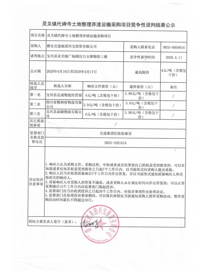 雅安交建集團(tuán)興寶投資有限公司靈關(guān)鎮(zhèn)代碑寺土地整理?xiàng)壴\(yùn)輸采購(gòu)項(xiàng)目競(jìng)爭(zhēng)性談判結(jié)果公示