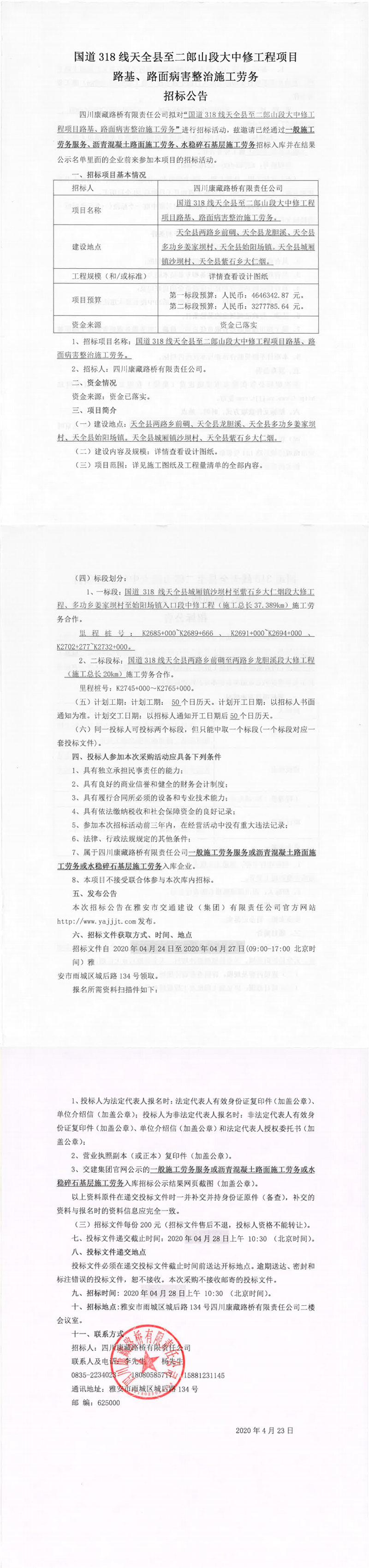 四川康藏路橋有限責(zé)任公司國道318線天全縣至二郎山段大中修工程項目路基、路面病害整治施工勞務(wù)招標(biāo)公告