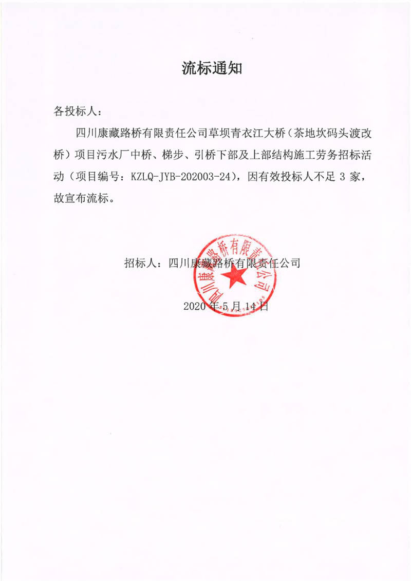 四川康藏路橋有限責(zé)任公司草壩青衣江大橋(茶地坎碼頭渡改橋)項目污水廠中橋、梯步、引橋下部及上部結(jié)構(gòu)施工勞務(wù)流標(biāo)通知