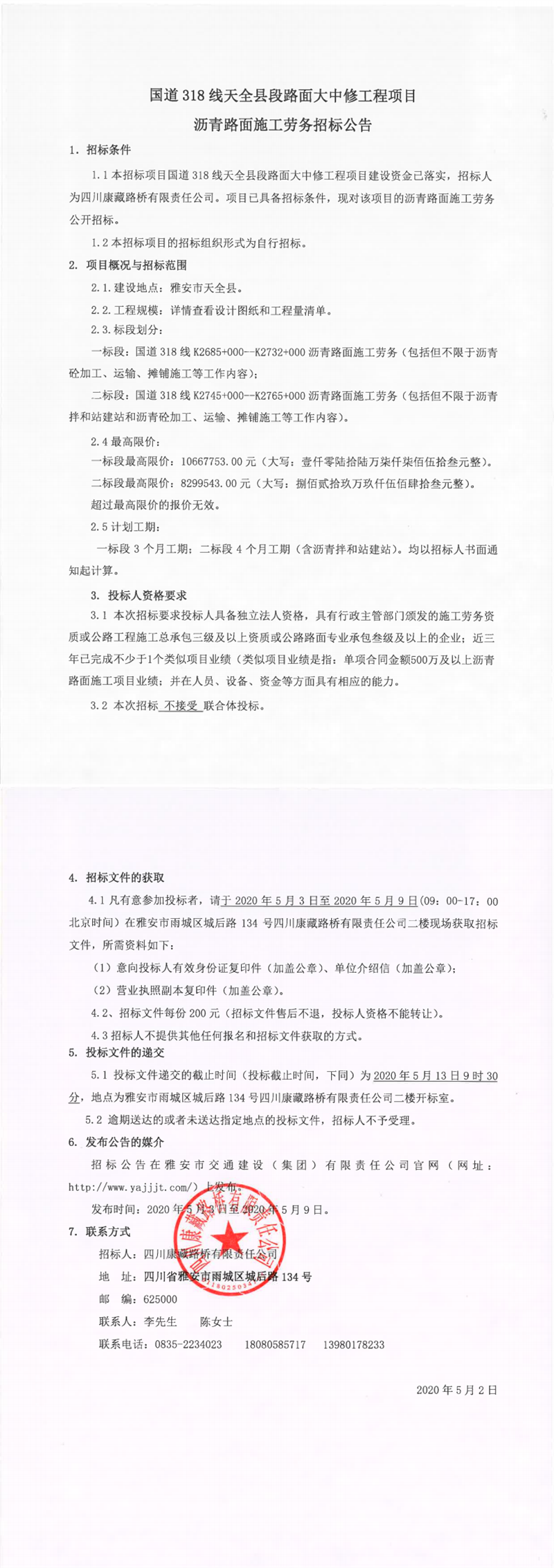 四川康藏路橋有限責(zé)任公司國道318線天全縣段路面大中修工程項目瀝青路面施工勞務(wù)招標(biāo)公告