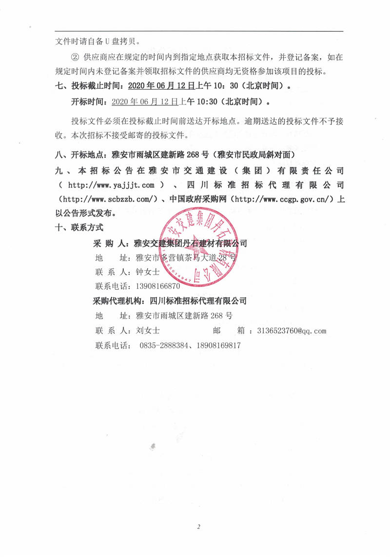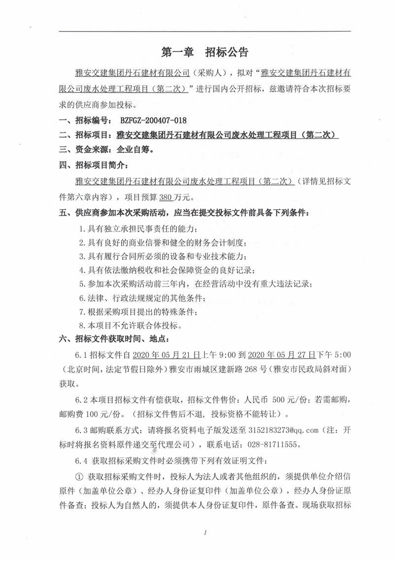 雅安交建集團丹石建材有限公司廢水處理工程項目(第二次)招標(biāo)公告