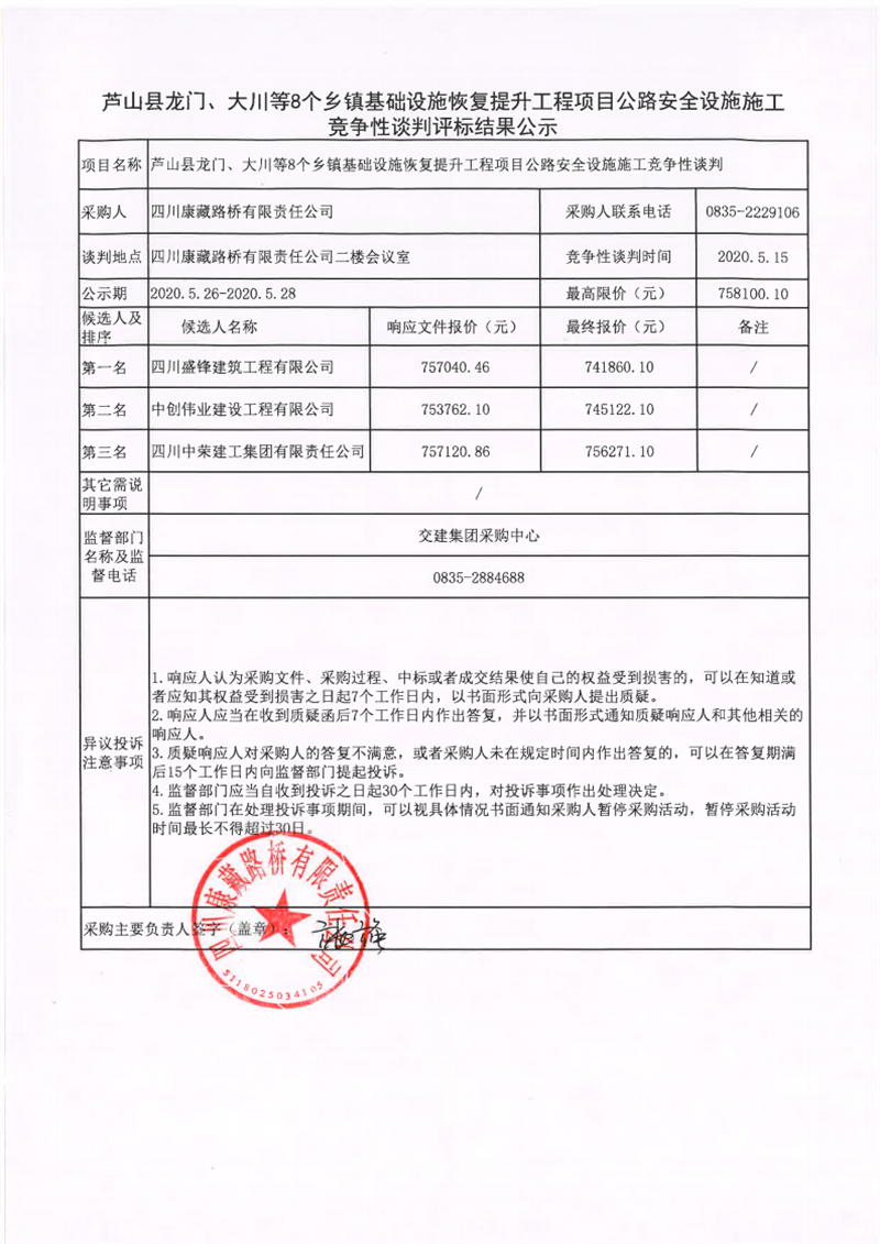四川康藏路橋有限責任公司蘆山縣龍門、大川等8個鄉(xiāng)鎮(zhèn)基礎設施恢復提升工程項目公路安全設施施工競爭性談判評標結果公示