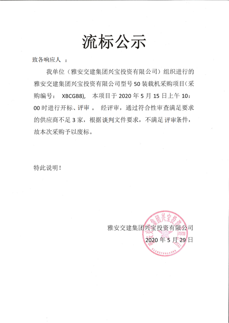 雅安交建集團(tuán)興寶投資有限公司型號(hào)50裝載機(jī)采購(gòu)項(xiàng)目流標(biāo)公示