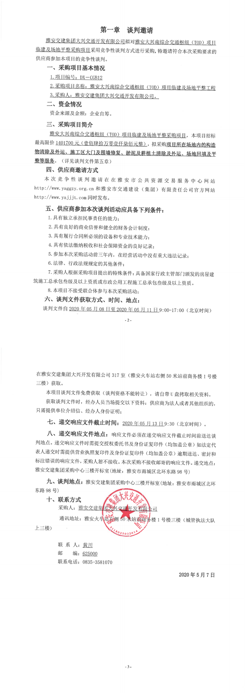 雅安交建集團大興交通開發(fā)有限公司雅安大興南綜合交通樞紐(TOD)項目臨建及場地平整工程競爭性談判公告