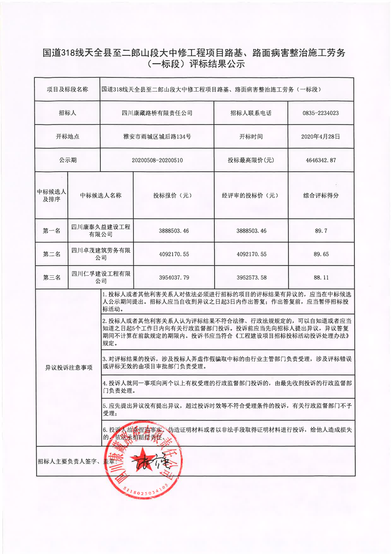 四川康藏路橋有限責(zé)任公司國(guó)道318線(xiàn)天全縣至二郎山段大中修工程項(xiàng)目路基、路面病害整治施工勞務(wù)(一標(biāo)段)評(píng)標(biāo)結(jié)果公示