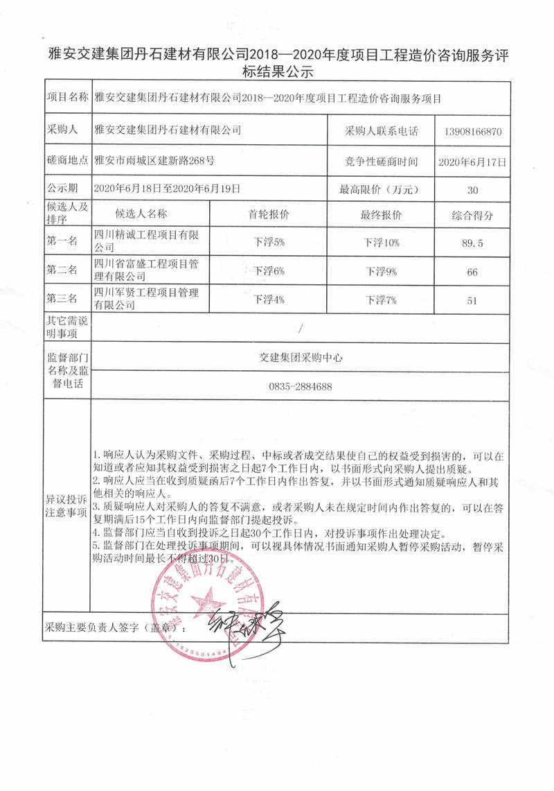 雅安交建集團(tuán)丹石建材有限公司2018—2020年度項(xiàng)目工程造價咨詢服務(wù)評標(biāo)結(jié)果公示
