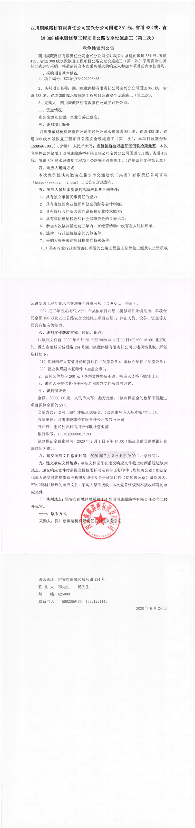 四川康藏路橋有限責任公司寶興分公司國道351線、省道432線、省道308線水毀修復(fù)工程項目公路安全設(shè)施施工(第二次)競爭性談判公告
