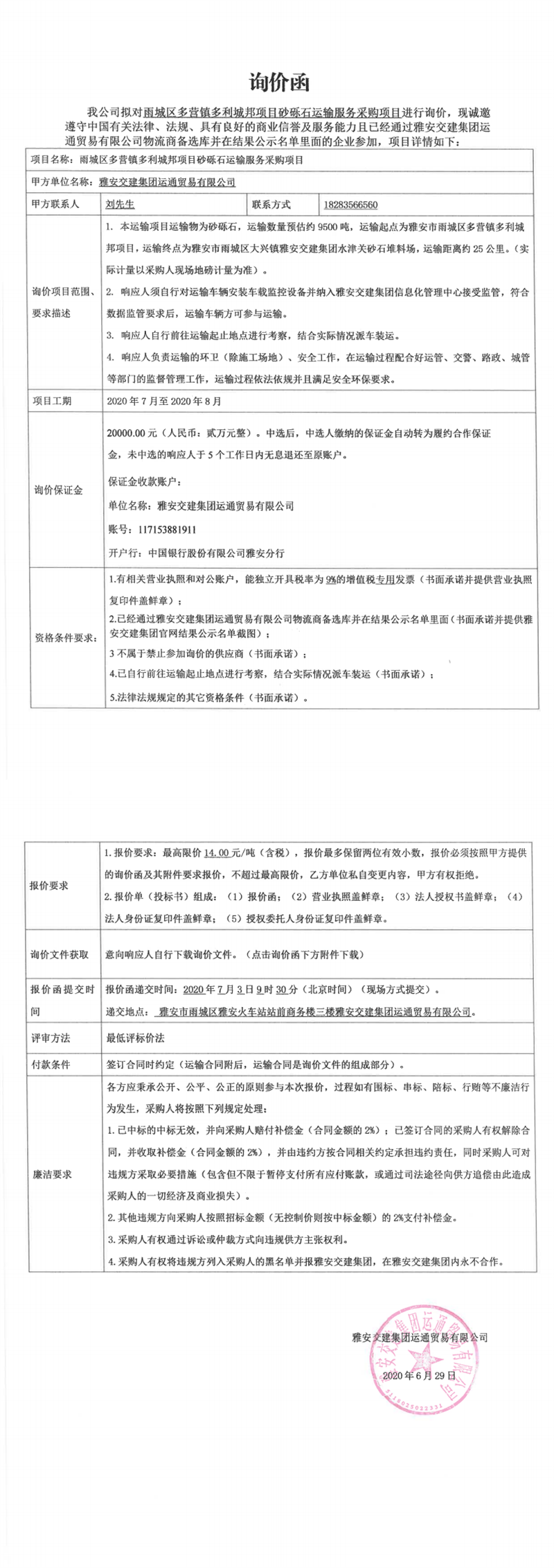 雅安交建集團(tuán)運(yùn)通貿(mào)易有限公司雨城區(qū)多營(yíng)鎮(zhèn)多利城邦項(xiàng)目砂礫石運(yùn)輸服務(wù)采購(gòu)項(xiàng)目詢價(jià)函