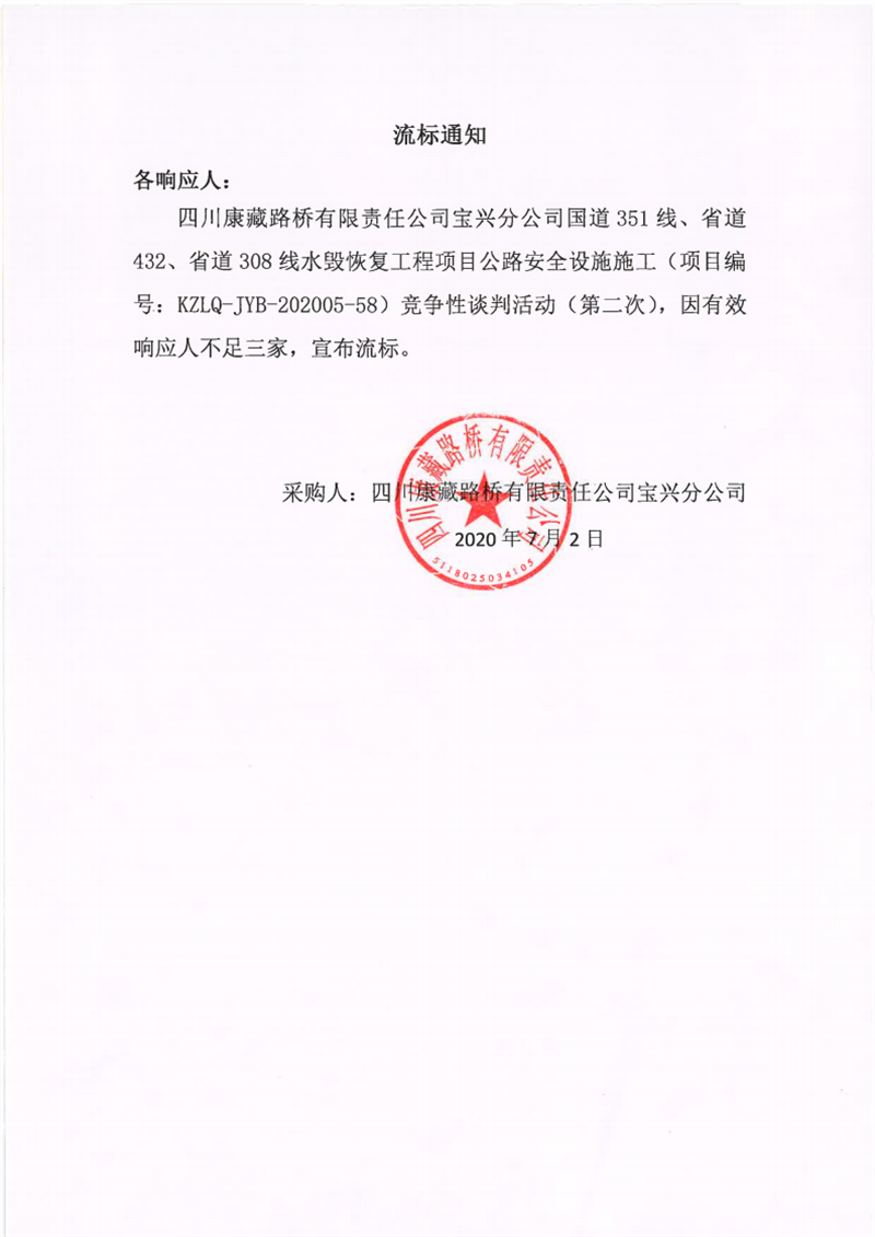 四川康藏路橋有限責任公司寶興分公司國道351線、省道432線、省道308線水毀恢復項目公路安全設施施工競爭性談判(第二次)流標通知