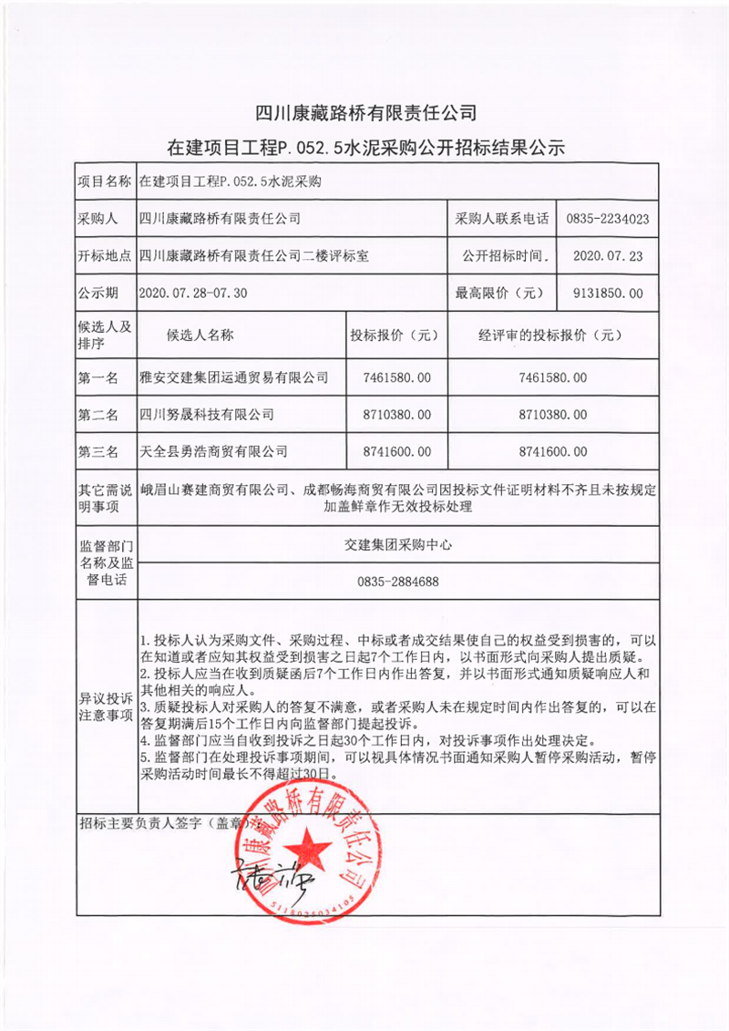 四川康藏路橋有限責(zé)任公司在建項目工程P.052.5水泥采購公開招標結(jié)果公示