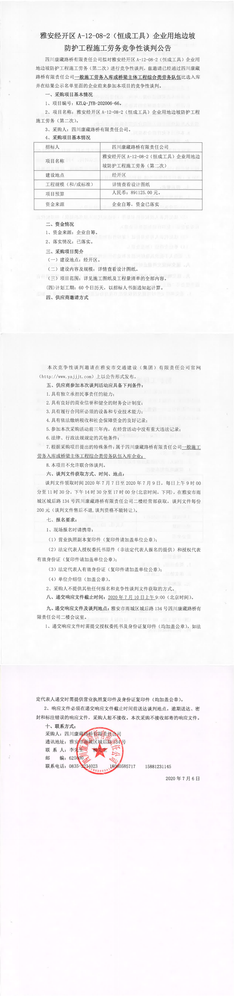 四川康藏路橋有限責(zé)任公司雅安經(jīng)開區(qū)A-12-08-2(恒成工具)企業(yè)用地邊坡防護工程施工勞務(wù)(第二次)競爭性談判公告