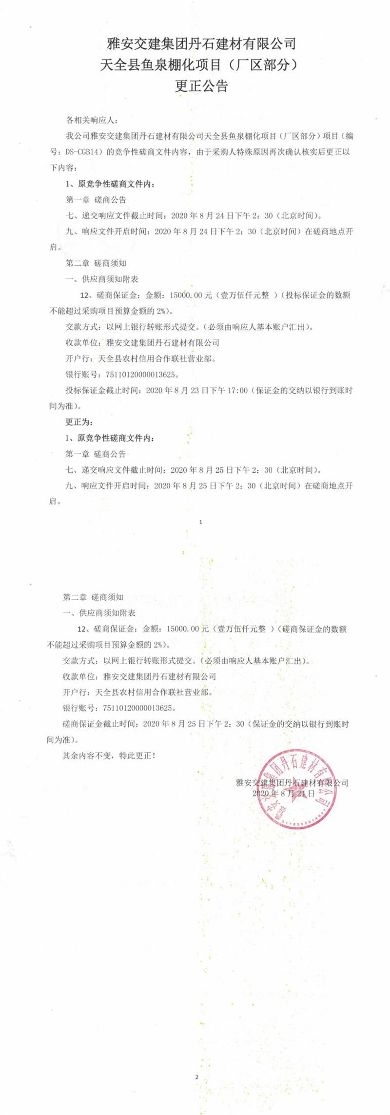 雅安交建集團(tuán)丹石建材有限公司天全縣魚(yú)泉棚化項(xiàng)目(廠(chǎng)區(qū)部分)更正公告