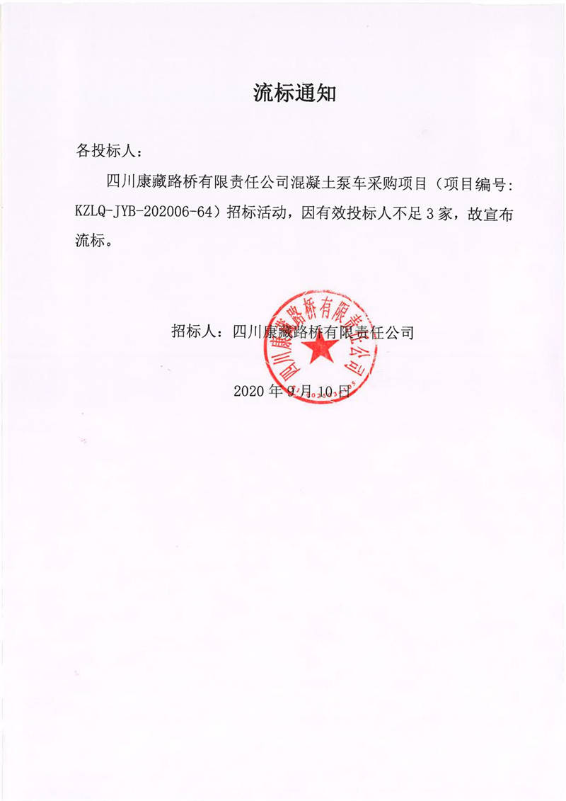 四川康藏路橋有限責(zé)任公司混凝土泵車采購項目流標(biāo)通知