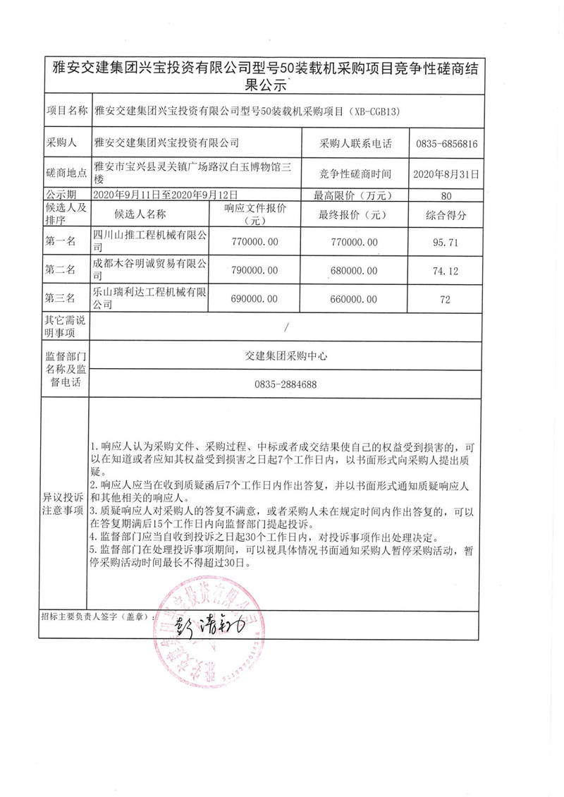 雅安交建集團興寶投資有限公司型號50裝載機采購項目競爭性磋商結果公示