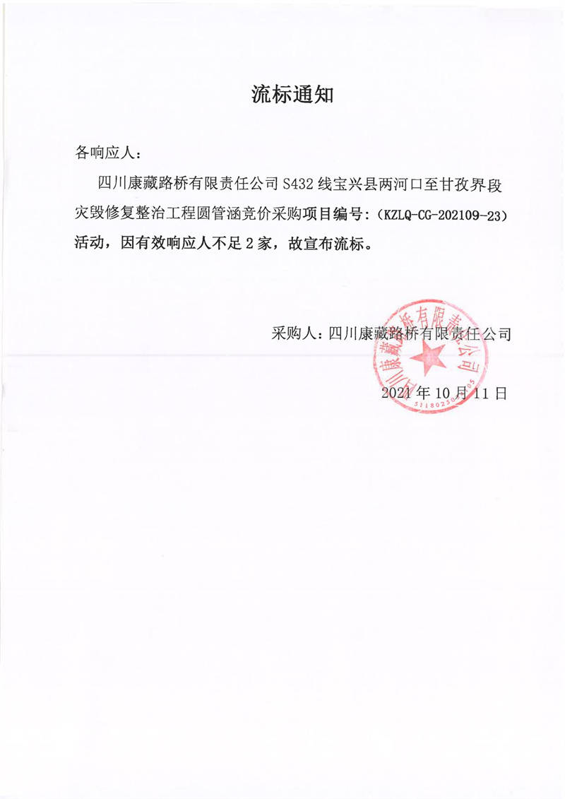四川康藏路橋有限責(zé)任公司S432線寶興縣兩河口至甘孜界段災(zāi)毀修復(fù)整治工程圓管涵采購競(jìng)價(jià)流標(biāo)通知