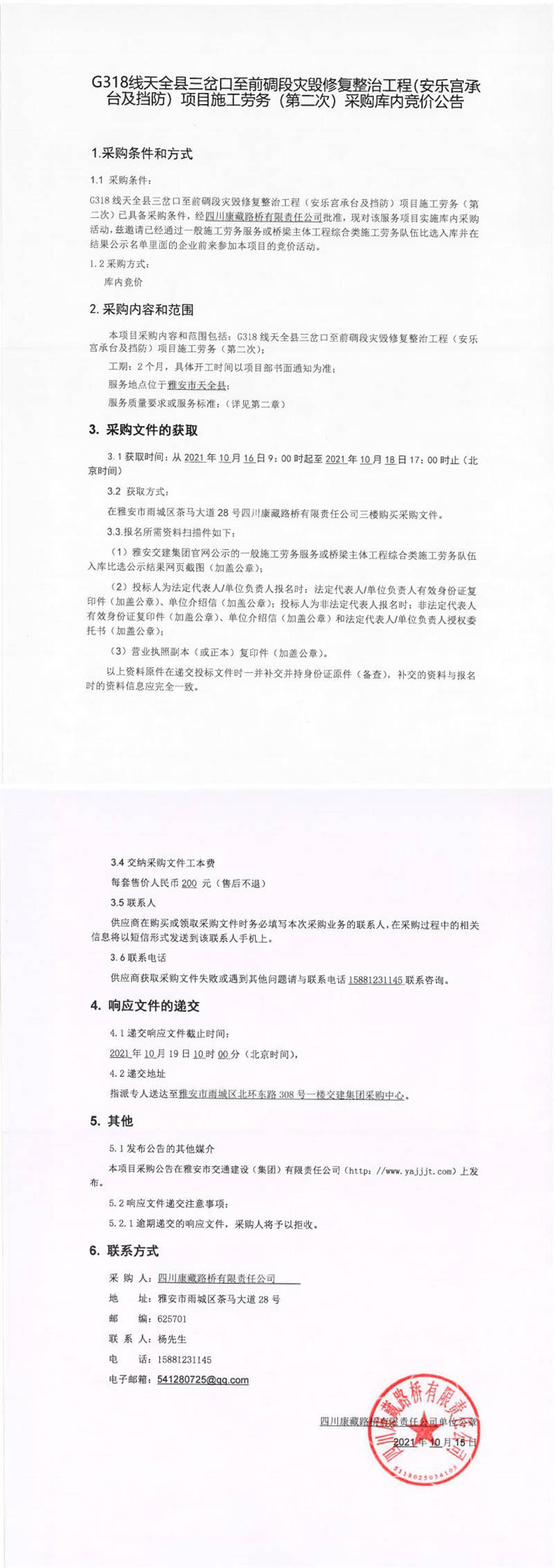 四川康藏路橋有限責(zé)任公司G318線天全縣三岔口至前碉段災(zāi)毀修復(fù)整治工程(安樂宮承臺及擋防)項目施工勞務(wù)(第二次)采購庫內(nèi)競價公告