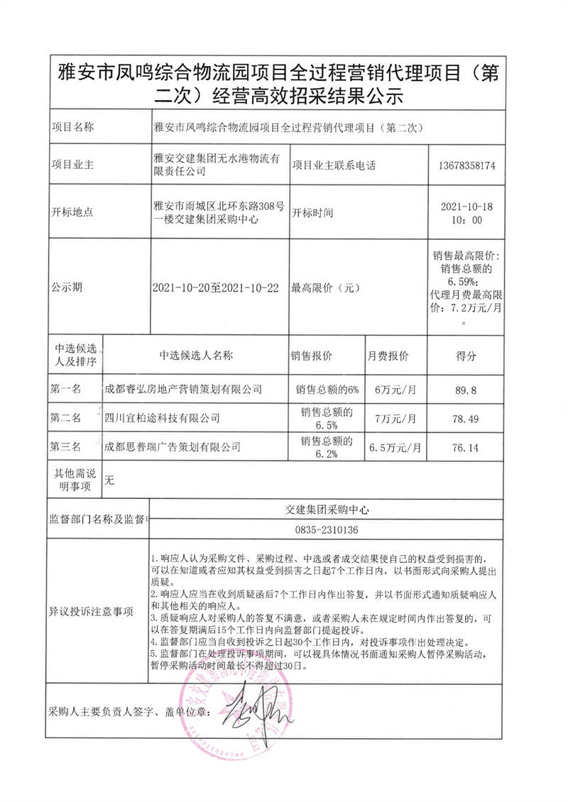 雅安交建集團無水港物流有限責(zé)任公司雅安市鳳鳴綜合物流園項目全過程營銷代理項目(第二次)經(jīng)營高效招采結(jié)果公示