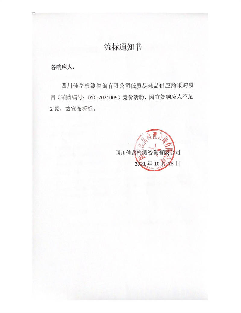 四川佳岳檢測(cè)咨詢(xún)有限公司低質(zhì)易耗品供應(yīng)商采購(gòu)項(xiàng)目流標(biāo)通知