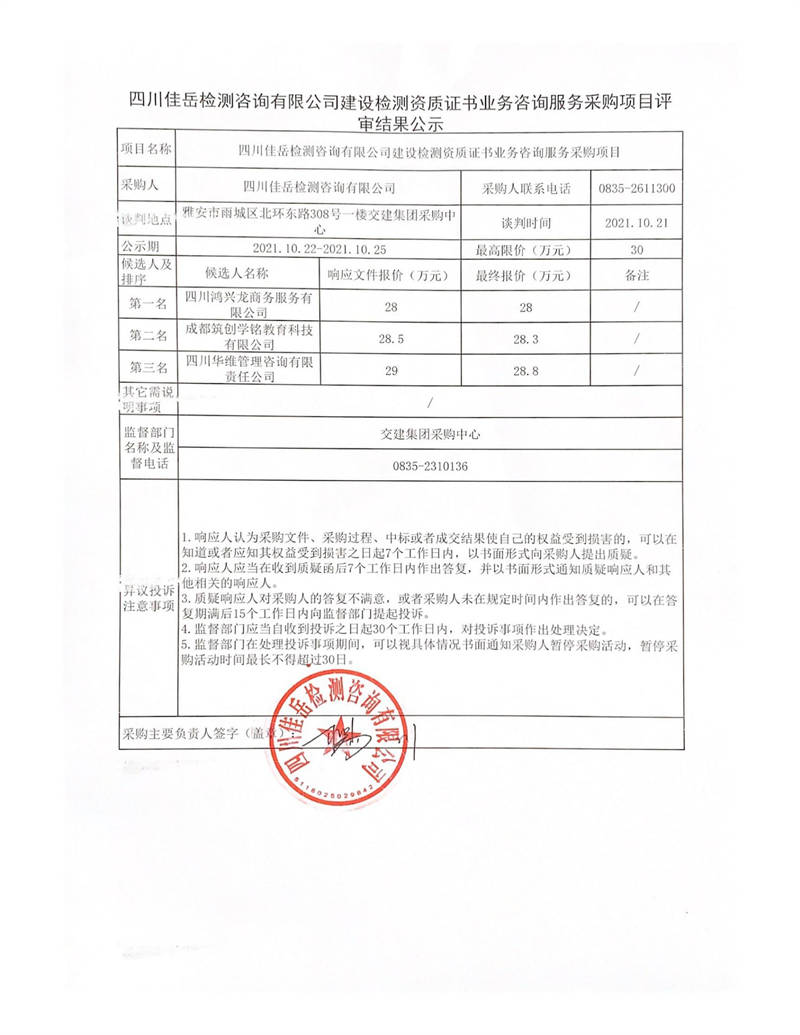 四川佳岳檢測(cè)咨詢有限公司建設(shè)檢測(cè)資質(zhì)證書業(yè)務(wù)咨詢服務(wù)采購(gòu)項(xiàng)目評(píng)審結(jié)果公示