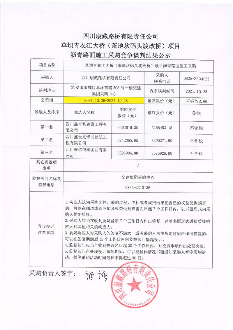 四川康藏路橋有限責任公司草壩青衣江大橋(茶地坎碼頭渡改橋)項目瀝青路面施工采購競爭談判結(jié)果公示