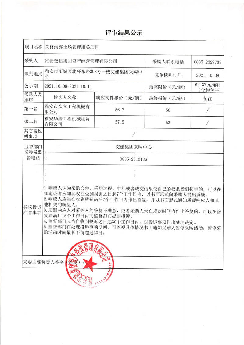 雅安交建集團資產經營管理有限公司關材溝棄土場管理服務項目評審結果公示
