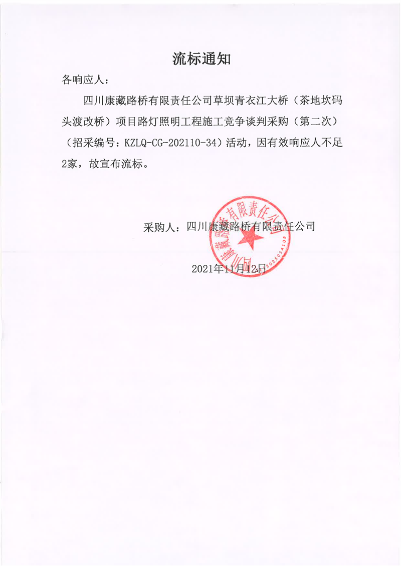 四川康藏路橋有限責(zé)任公司草壩青衣江大橋(茶地坎碼頭渡改橋)項(xiàng)目路燈照明工程施工競(jìng)爭(zhēng)談判采購(gòu)(第二次)流標(biāo)通知