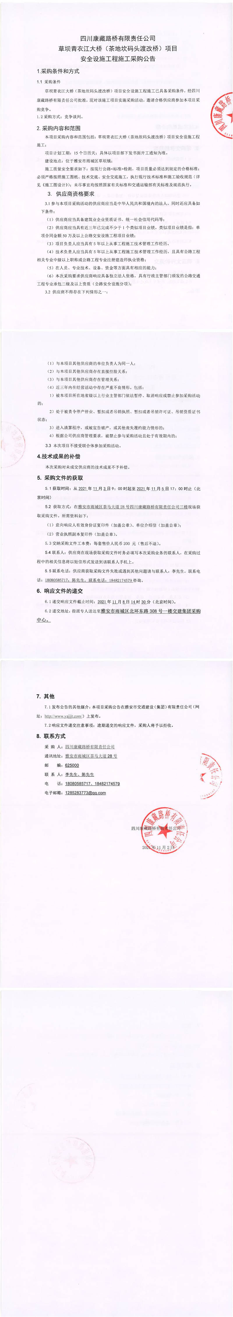 四川康藏路橋有限責(zé)任公司草壩青衣江大橋(茶地坎碼頭渡改橋)項(xiàng)目安全設(shè)施工程施工采購公告