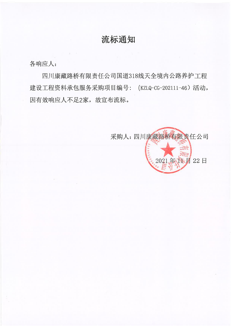四川康藏路橋有限責任公司國道318線天全境內公路養(yǎng)護工程建設工程資料承包服務采購流標通知