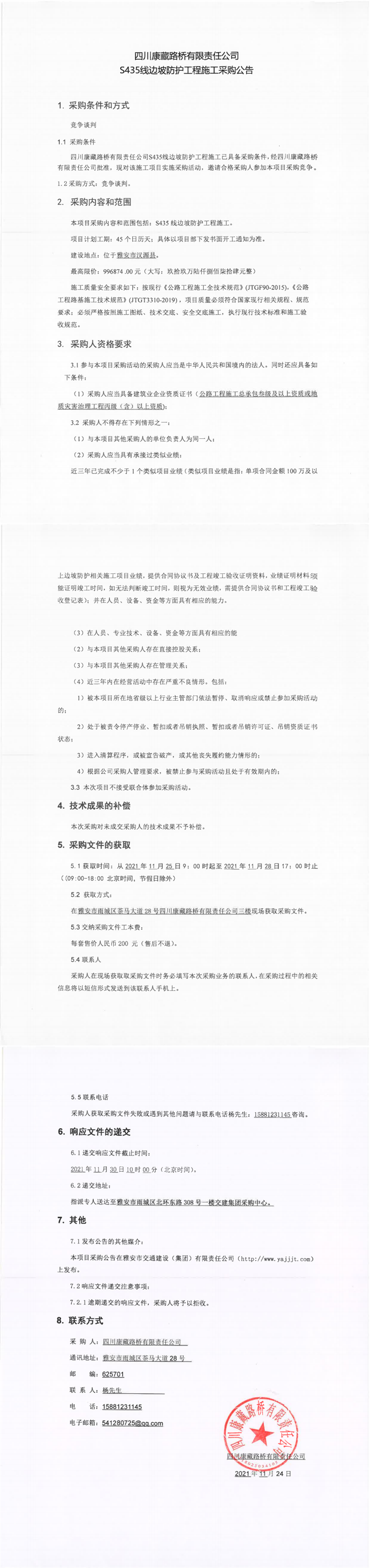 四川康藏路橋有限責(zé)任公司S435線邊坡防護(hù)工程施工采購公告