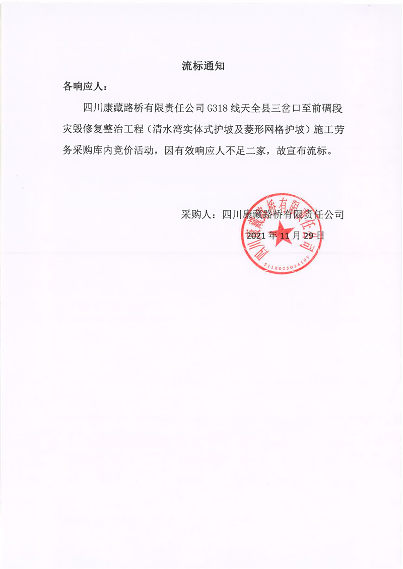 四川康藏路橋有限責任公司G318線天全縣三岔口至前碉段災毀修復整治工程(清水灣實體式護坡及菱形網格護坡)施工勞務采購流標通知
