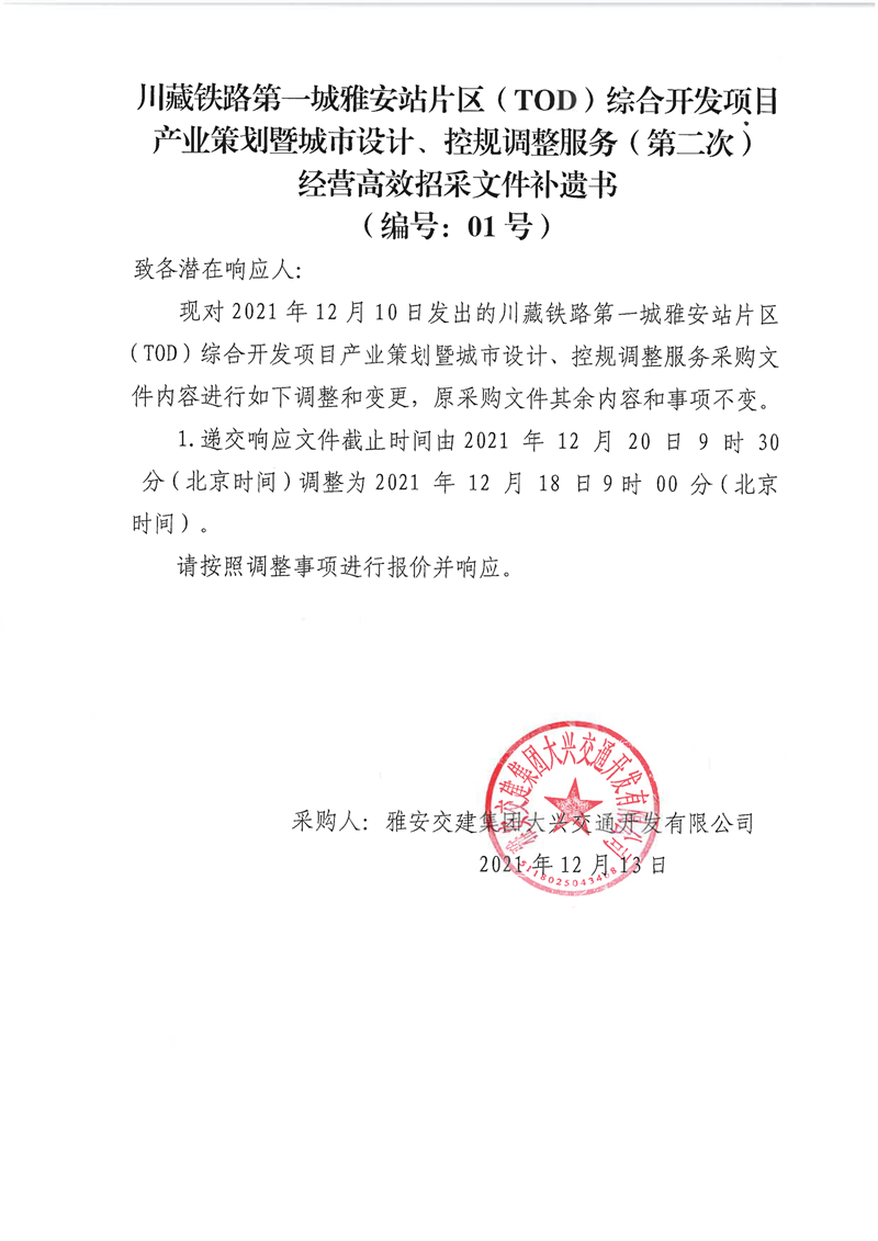 雅安交建集團(tuán)大興交通開發(fā)有限公司川藏鐵路第一城雅安站片區(qū)(TOD)綜合開發(fā)項(xiàng)目產(chǎn)業(yè)策劃暨城市設(shè)計(jì)、控規(guī)調(diào)整服務(wù)(第二次)經(jīng)營高效招采文件補(bǔ)遺書(編號(hào):01號(hào))