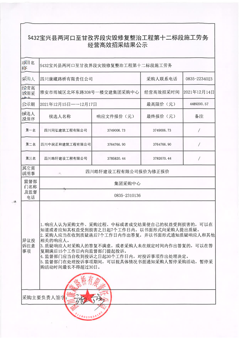 四川康藏路橋有限責(zé)任公司S432線寶興縣兩河口至甘孜界段災(zāi)毀修復(fù)整治工程第十二標(biāo)段施工勞務(wù)經(jīng)營(yíng)高效招采結(jié)果公示