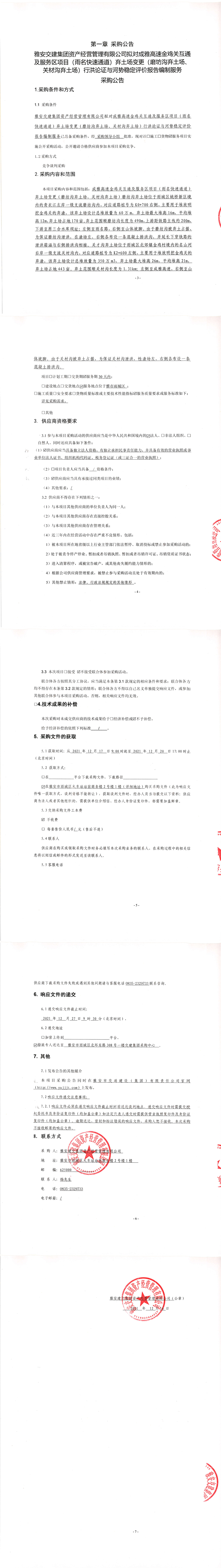 雅安交建集團(tuán)資產(chǎn)經(jīng)營管理有限公司擬對成雅高速金雞關(guān)互通及服務(wù)區(qū)項(xiàng)目(雨名快速通道)棄土場變更(磨坊溝棄土場、關(guān)材溝棄土場)行洪論證與河勢穩(wěn)定評價報告編制服務(wù)采購公告