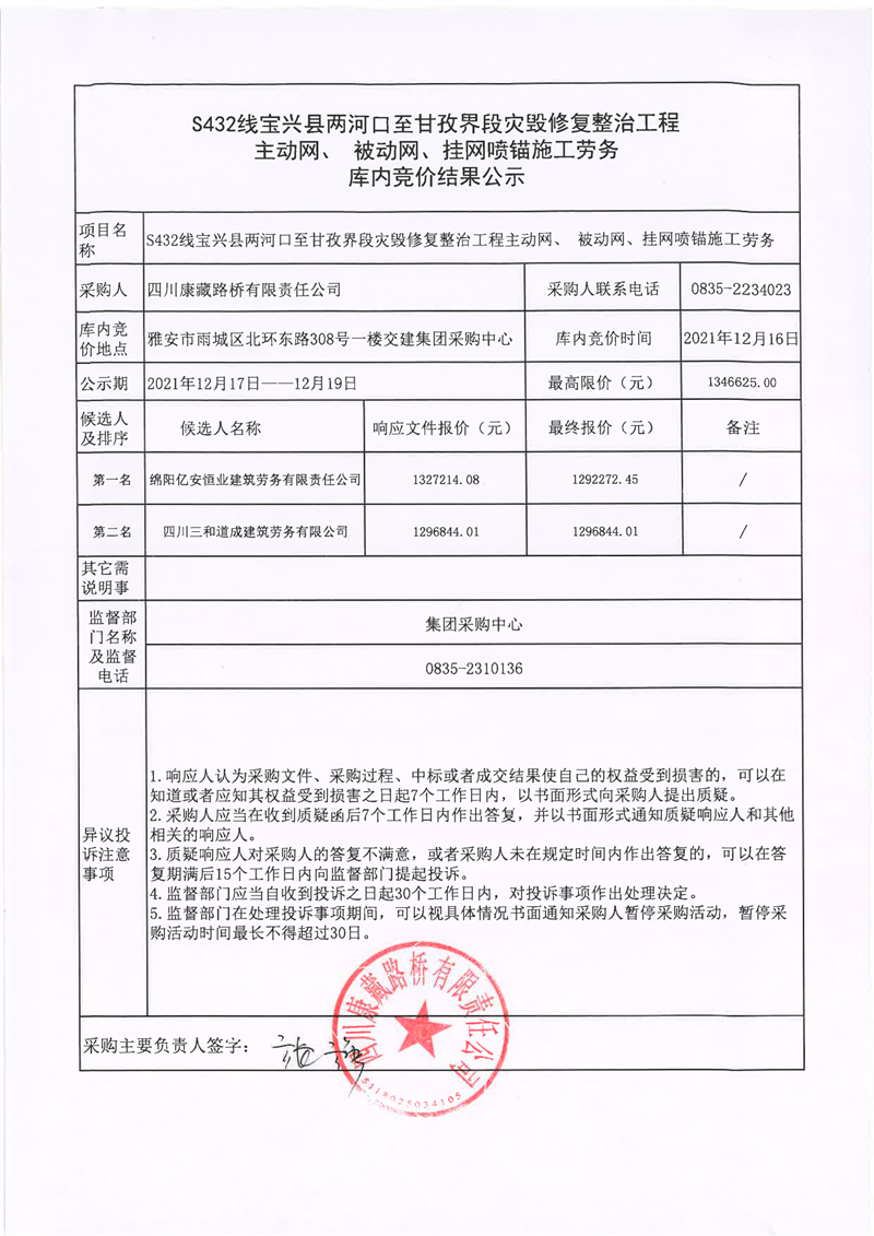 四川康藏路橋有限責任公司S432線寶興縣兩河口至甘孜界段災(zāi)毀修復整治工程主動網(wǎng)、補動網(wǎng)、掛網(wǎng)噴錨施工勞務(wù)庫內(nèi)競價結(jié)果公示