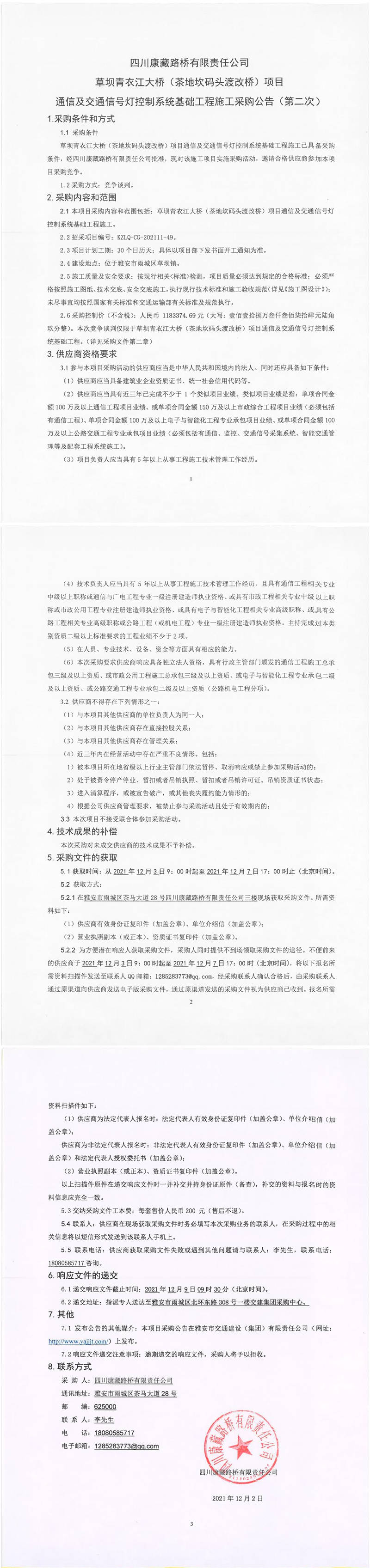 四川康藏路橋有限責任公司草壩青衣江大橋(茶地坎碼頭渡改橋)項目通信及交通信號燈控制系統基礎工程施工采購公告(第二次)