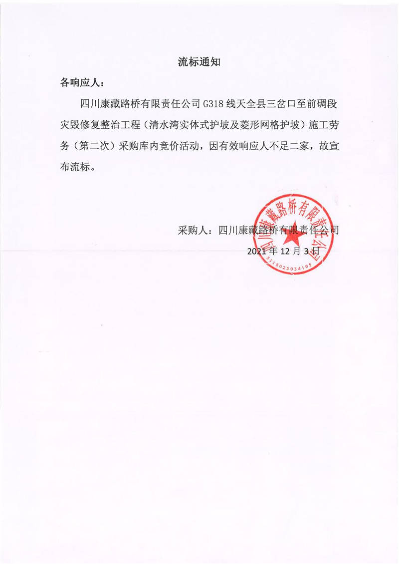 四川康藏路橋有限責(zé)任公司G318線天全縣三岔口至前碉段災(zāi)毀修復(fù)整治工程(清水灣實體式護坡及菱形網(wǎng)格護坡)施工勞務(wù)(第二次)采購流標(biāo)通知
